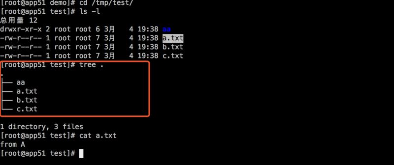 然后我們?cè)偃ゲ榭?tmp/test目錄,你會(huì)發(fā)現(xiàn)目錄A、B、C被合并到了一起,并且相同文件名的文件會(huì)進(jìn)行“覆蓋”,這里覆蓋并不是真正的覆蓋,而是當(dāng)合并時(shí)候目錄中兩個(gè)文件名稱(chēng)都相同時(shí),merged層目錄會(huì)顯示離它最近層的文件: