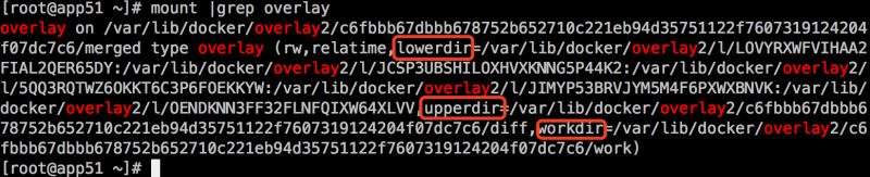 查看其overlay掛載點(diǎn),可以發(fā)現(xiàn)其掛載的merged目錄、lowerdir、upperdir以及workdir: