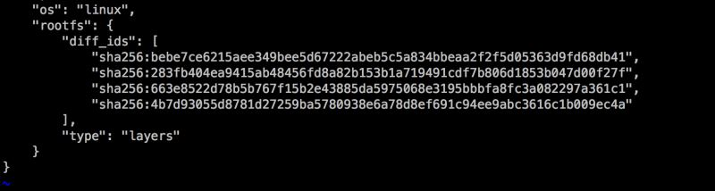 查看其對(duì)應(yīng)的元數(shù)據(jù)(使用vim :%!python -m json.tool格式化成json) 截取了其rootfs的構(gòu)成: