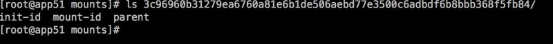 mountedLayer 信息存儲(chǔ)的可讀init層以及容器掛載點(diǎn)信息包括:容器 init 層ID(init-id)、聯(lián)合掛載使用的ID(mount-id)以及容器層的父層鏡像的 chainID(parent)。相關(guān)文件位于/var/lib/docker/image/<storage_driver>/layerdb/mounts/<container_id>/ 目錄下。如下啟動(dòng)一個(gè)id為3c96960b3127的容器: