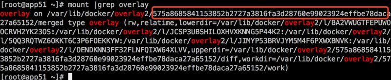 查看mountID還可以直接通過(guò)mount命令查看對(duì)應(yīng)掛載的mountID,對(duì)應(yīng)著/var/lib/docker/overlay2/目錄,這也是overlayfs呈現(xiàn)的merged目錄: