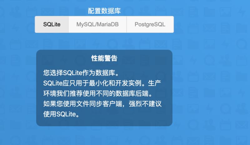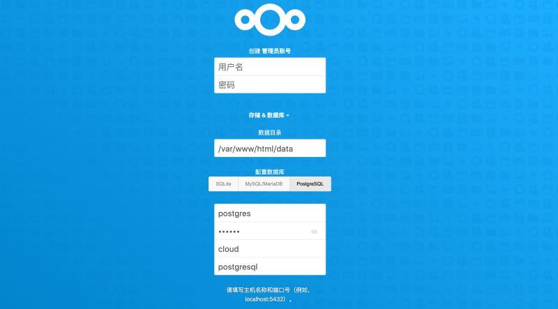 注: 但是我填的postgresql是不是有點眼熟,對,就是--link(方式二里面使用的net方式,目的一樣). 我的數(shù)據(jù)庫用的也是docker容器,使用--link可以將PostgreSQL數(shù)據(jù)庫的容器以別名形式傳遞過來,所以這邊直接可以使用postgresql表示數(shù)據(jù)庫(這是docker容器間的一種通信方式,注意一點是PostgreSQL容器一定要在nextcloud容器前啟動).