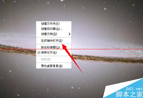 5、當(dāng)然我們也可以使用命令進(jìn)行關(guān)閉,右鍵點擊桌面空白區(qū)域,選擇【在終端中打開】