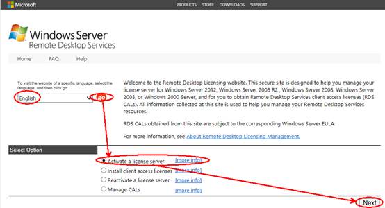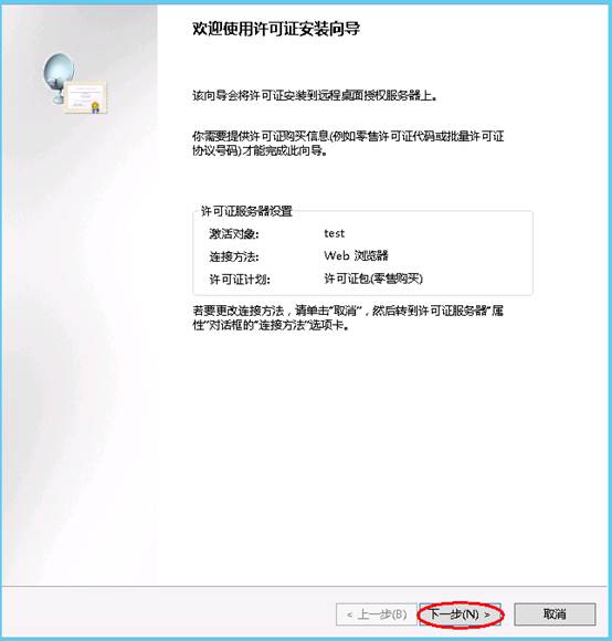 2.4 在Internet Explorer瀏覽器地址欄中輸入https://activate.microsoft.com,點(diǎn)擊GO ,開始注冊并獲取服務(wù)器許可密碼向?qū)А4_保已選中“啟用許可證服務(wù)器”項(xiàng)后單擊"下一步"按鈕。