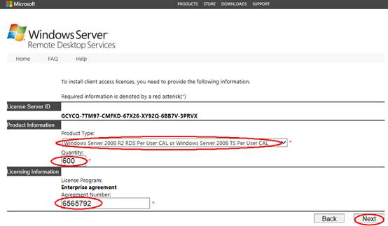 2.9 在如下界面,“產(chǎn)品類型”選擇“Windwos Server 2019 R2遠(yuǎn)程桌面服務(wù)器每用戶訪問許可”,產(chǎn)品類型中,一般選擇用戶客戶端訪問證書。;最大用戶數(shù)(比如為"600");在“注冊號碼”中輸入從微軟獲得的七位注冊號碼(如果沒有許可證,嘗試輸入5296992、6565792、4954438、6879321),再點(diǎn)擊“下一步”。