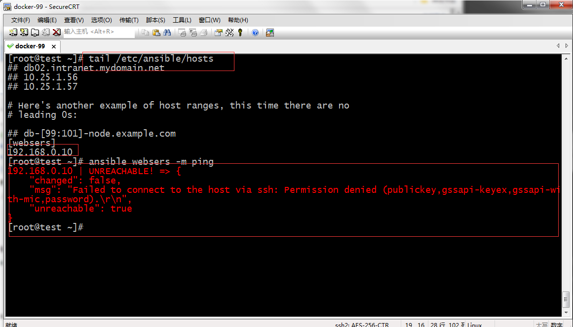 提示:我們?cè)谥鳈C(jī)清單上配置了所管控的主機(jī)地址,但是直接用ansible的ping模塊去探測(cè)主機(jī)的存活情況,卻顯示權(quán)限拒絕。從提示上說(shuō)讓我們要指定用什么驗(yàn)證。默認(rèn)情況ansible是通過(guò)ssh的key驗(yàn)證的,所以我們?cè)赼nsible的主機(jī)清單中配置了管控主機(jī)的ip是不夠的,還要配置ssh基于KEY驗(yàn)證