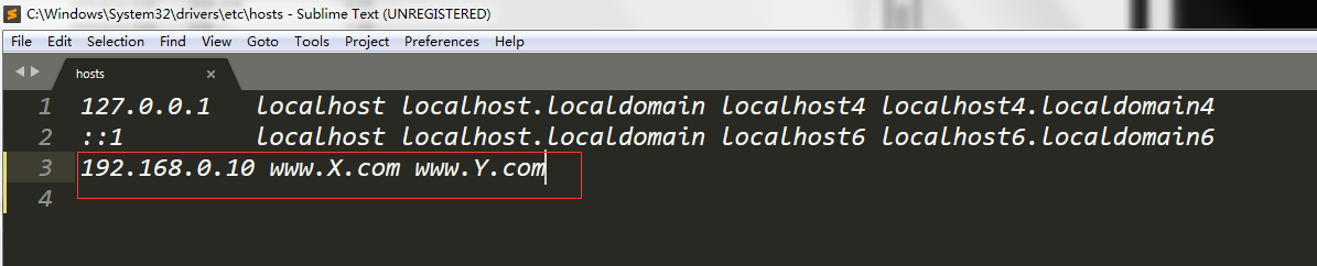 [root@test ~]# cat /etc/hosts 127.0.0.1 localhost localhost.localdomain localhost4 localhost4.localdomain4 ::1 localhost localhost.localdomain localhost6 localhost6.localdomain6 192.168.0.10 www.X.com www.Y.com [root@test ~]#