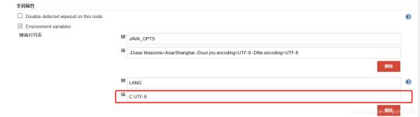3.然后Jenkins系統(tǒng)設(shè)置修改全局屬性,將之前的LANG = zh_CN .UTF-8改成LANG = C.UTF-8 原因是:目前市場上做服務(wù)器基本被centos和debian占據(jù)吧,centos依靠redhat,debian自源,centos源于紅帽,各種補丁以及服務(wù)更完善些,centos做服務(wù)器也較多吧,自動化部門我沒猜錯的話jenkins所在的宿主機用的是debian系統(tǒng)不是centos,因為debian中l(wèi)ocale是支持zh_CN.UTF-8,centos支持C.UTF-8