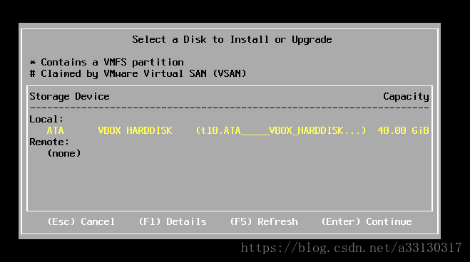 5. 選擇將EXSI 安裝到哪個(gè)硬盤上,我這里使用的是虛擬機(jī),所以只有這一個(gè)選項(xiàng).