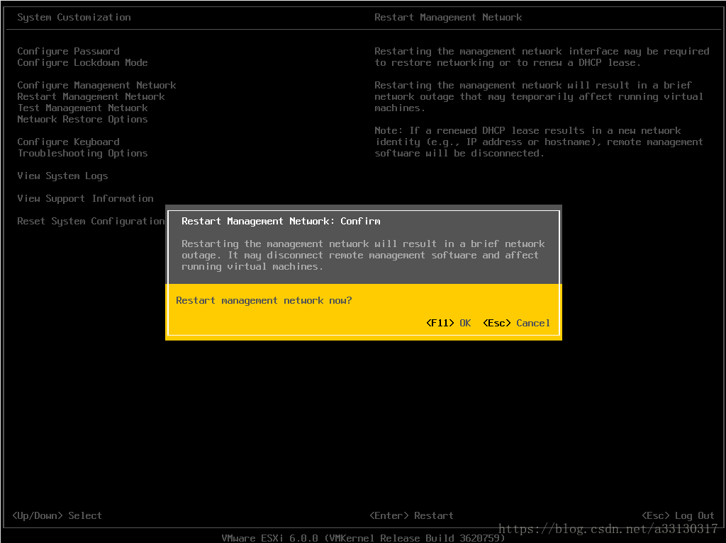 13. 重啟網(wǎng)絡(luò)配置,點(diǎn)擊RestartManagement network選項(xiàng),并點(diǎn)擊F11