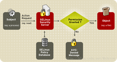 當(dāng)一個subject(如: 一個應(yīng)用)試圖訪問一個object(如:一個文件),Kernel中的策略執(zhí)行服務(wù)器將檢查AVC (Access Vector Cache), 在AVC中,subject和object的權(quán)限被緩存(cached)。如果基于AVC中的數(shù)據(jù)不能做出決定,則請求安全服務(wù)器,安全服務(wù)器在一個矩陣中查找“應(yīng)用+文件”的安全環(huán)境。然后根據(jù)查詢結(jié)果允許或拒絕訪問,拒絕消息細(xì)節(jié)位于/var/log/messages中。