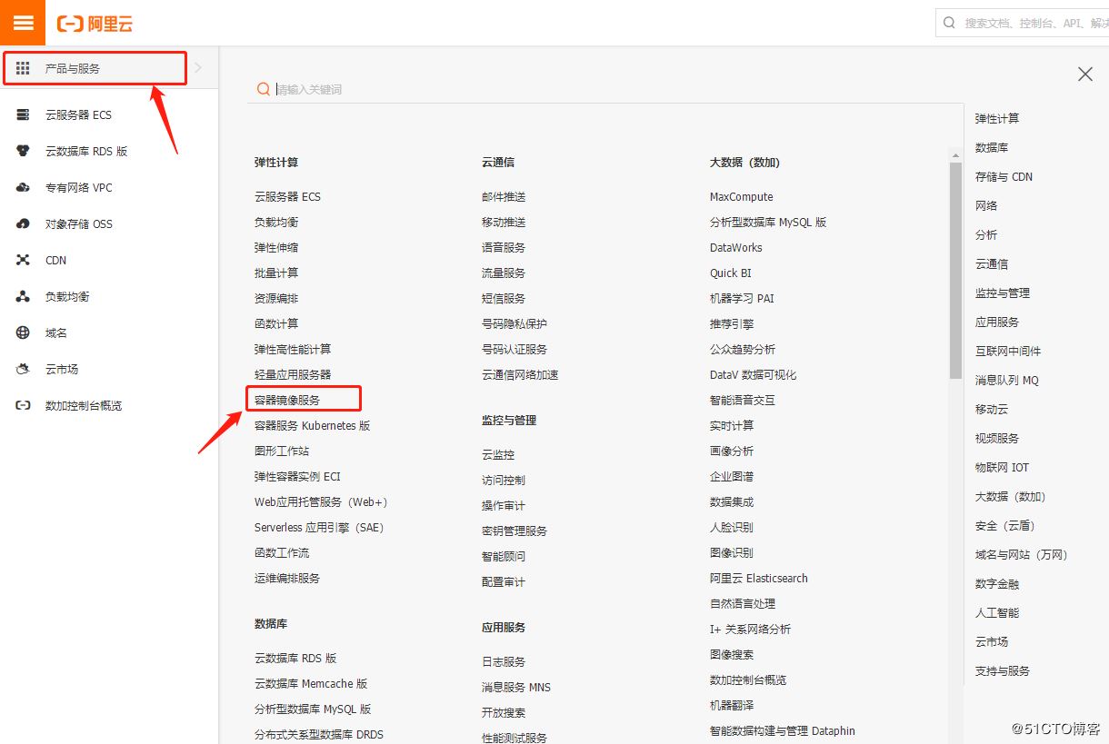 (3)選擇產(chǎn)品與服務(wù),然后選擇容器鏡像服務(wù)