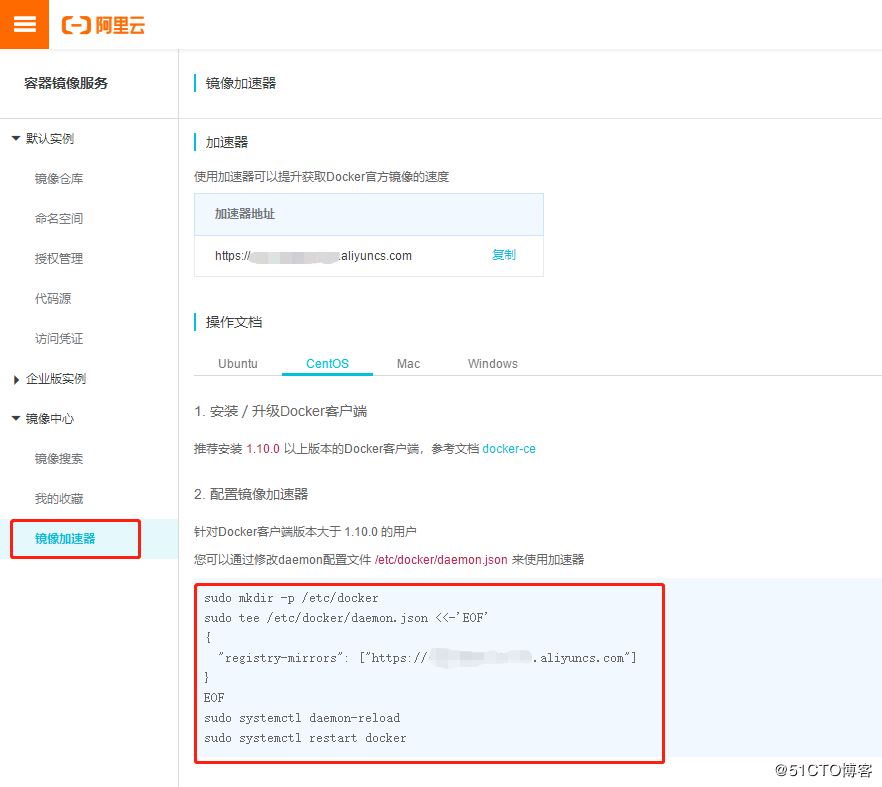 (4)選擇最下面的鏡像加速器,這時(shí)候就可以根據(jù)你的系統(tǒng)提供相應(yīng)的加速器地址了,每個(gè)人都有自己的加速器地址