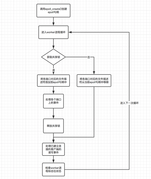 在前面的文章中,我們講到,每個worker進程被創(chuàng)建的時候,都會調用ngx_worker_process_init()方法初始化當前worker進程,這個過程中有一個非常重要的步驟,即每個worker進程都會調用epoll_create()方法為自己創(chuàng)建一個獨有的epoll句柄。對于每一個需要監(jiān)聽的端口,都有一個文件描述符與之對應,而worker進程只有將該文件描述符通過epoll_ctl()方法添加到當前進程的epoll句柄中,并且監(jiān)聽accept事件,此時才會被客戶端的連接建立事件觸發(fā),從而處理該事件。從這里也可以看出,worker進程如果沒有將所需要監(jiān)聽的端口對應的文件描述符添加到該進程的epoll句柄中,那么其是無法被觸發(fā)對應的事件的?;谶@個原理,nginx就使用了一個共享鎖來控制當前進程是否有權限將需要監(jiān)聽的端口添加到當前進程的epoll句柄中,也就是說,只有獲取鎖的進程才會監(jiān)聽目標端口。通過這種方式,就保證了每次事件發(fā)生時,只有一個worker進程會被觸發(fā)。如下圖所示為worker進程工作循環(huán)的一個示意圖: