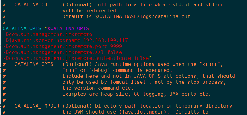 CATALINA_OPTS="$CATALINA_OPTS -Dcom.sun.management.jmxremote -Djava.rmi.server.hostname=192.168.100.117 -Dcom.sun.management.jmxremote.port=9999 -Dcom.sun.management.jmxremote.ssl=false -Dcom.sun.management.jmxremote.authenticate=false"