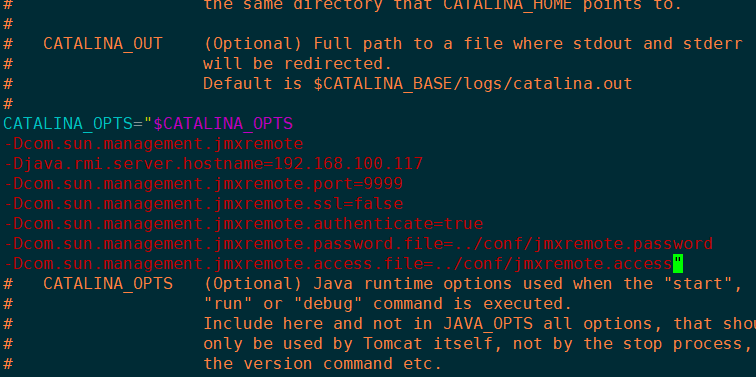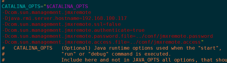 CATALINA_OPTS="$CATALINA_OPTS -Dcom.sun.management.jmxremote -Djava.rmi.server.hostname=192.168.100.117 -Dcom.sun.management.jmxremote.port=9999 -Dcom.sun.management.jmxremote.ssl=false -Dcom.sun.management.jmxremote.authenticate=true -Dcom.sun.management.jmxremote.password.file=../conf/jmxremote.password -Dcom.sun.management.jmxremote.access.file=../conf/jmxremote.access"