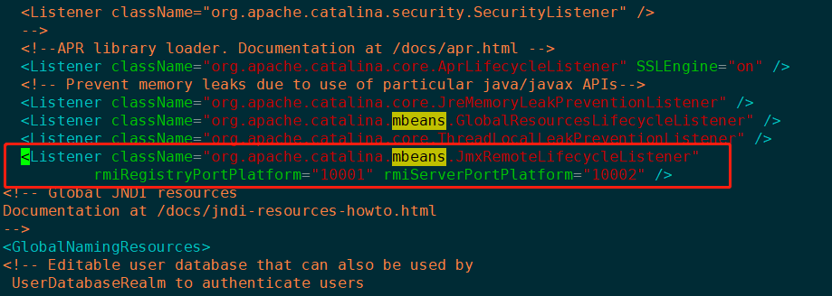 <Listener className="org.apache.catalina.mbeans.JmxRemoteLifecycleListener" rmiRegistryPortPlatform="10001" rmiServerPortPlatform="10002" />