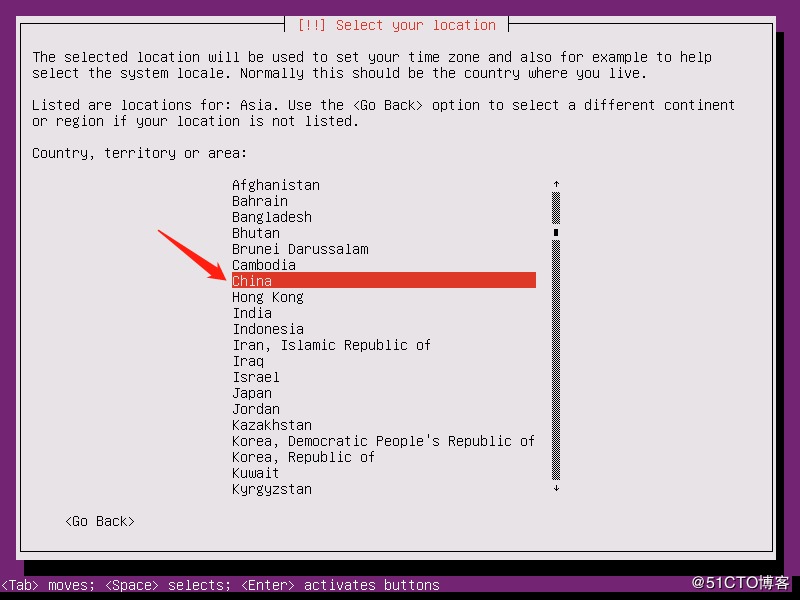 1.4 選擇地區(qū),這里先選擇最后一項(xiàng)other,然后回車再選擇Asia,最后選擇China