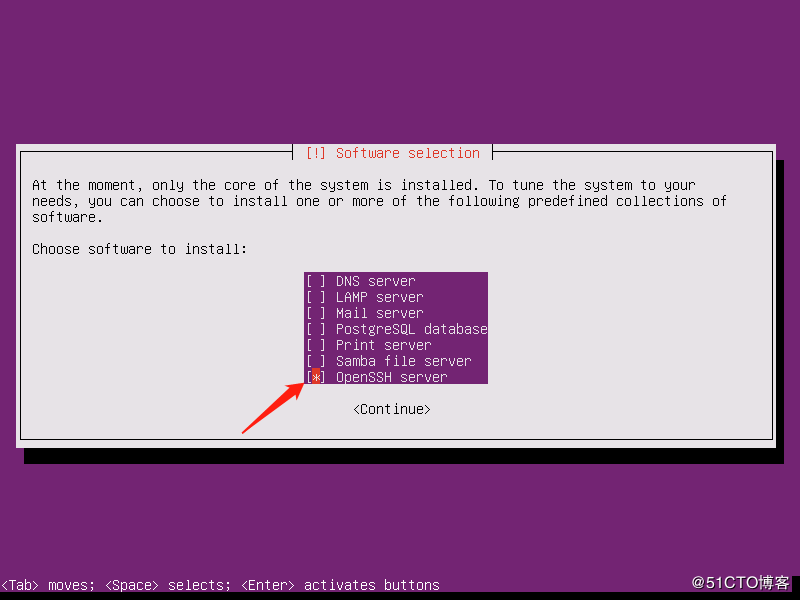 1.24 選擇安裝組件,選擇對應(yīng)需要安裝的組件,然后按空格鍵,這里選擇OpenSSH Server