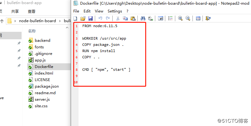 查看名字為Dockerfile的文件,Dockerfile文件描述了如何為容器組裝私有的文件系統(tǒng),并且還包含了一些描述如何基于此鏡像運(yùn)行容器的元數(shù)據(jù)。公告板應(yīng)用程序Dockerfile如圖1.2所示。