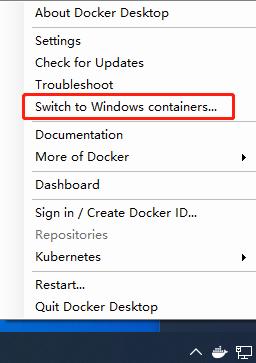 注意:本示例使用的是Linux容器。使用Docker Desktop的用戶,右鍵單擊系統(tǒng)托盤中的Docker徽標(biāo),確保您的環(huán)境正在運(yùn)行Linux容器,若不是,請點(diǎn)擊“Switch to Linux containers...",如圖1.3所示,我當(dāng)前演示環(huán)境使用的已是Linux容器。