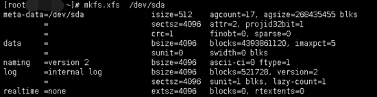 meta-data=/dev/sda isize=512 agcount=17, agsize=268435455 blks