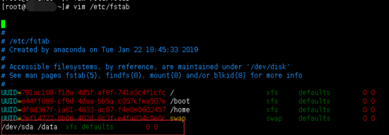 vim /etc/fstab /* 添加如下信息 */ /dev/sda /data xfs defaults 0 0