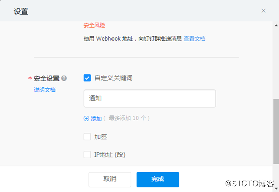 釘釘機(jī)器人需要進(jìn)行安全設(shè)置,這里我定義了關(guān)鍵詞”通知“,也就是說發(fā)送的消息中必須包含這個詞