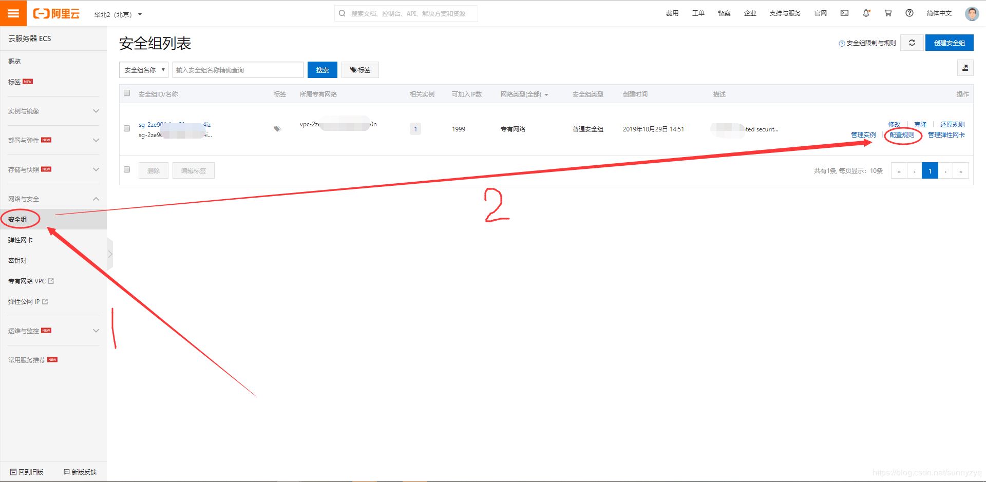 (3)點擊【安全組】,找到對應服務器實例的【配置規(guī)則】,點擊;