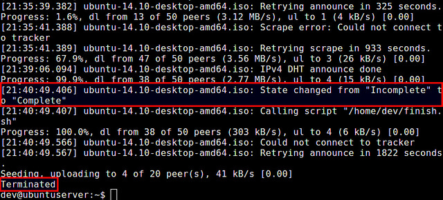 "-f /path/to/finish-script" 選項(xiàng)設(shè)置當(dāng)前下載完成后要運(yùn)行的腳本。注意 transmission-cli 默認(rèn)在文件下載完成后繼續(xù)運(yùn)行。如果你想在成功下載完成后自動(dòng)關(guān)閉 transmission-cli,你可以使用這個(gè)選項(xiàng)。下面這個(gè)簡(jiǎn)單的腳本可以完成這個(gè)功能。