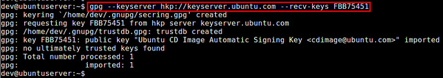 這樣做之前,你需要知道公共密鑰的 “key ID”,而這在上面的 gpg 命令的輸出中有顯示。在這個例子中,密鑰 ID 時 “FBB75451”。運行下面的命令來從官方 Ubuntu 密鑰服務器導入公共密鑰。