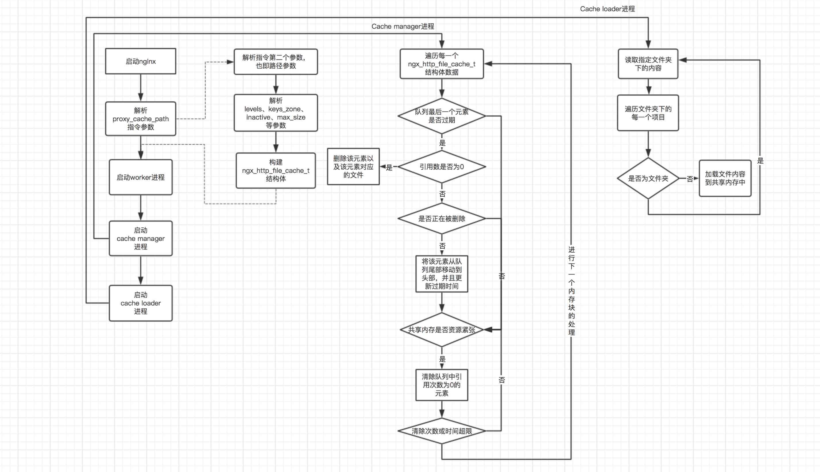 從上面的流程圖中可以看出,在主流程中,主要進(jìn)行了解析proxy_cache_path指令、啟動(dòng)cache manager進(jìn)程和啟動(dòng)cache loader進(jìn)程的工作。而在cache manager進(jìn)程中,主要工作則分為兩部分:1. 檢查隊(duì)列尾部元素是否過期,如果過期并且引用數(shù)為0,則刪除該元素和該元素對(duì)應(yīng)的文件;2. 檢查當(dāng)前共享內(nèi)存是否資源緊張,如果資源緊張,則刪除所有引用數(shù)為0的元素及其文件,無論其是否過期。在cache loader進(jìn)程的處理流程中,主要是通過遞歸的方式遍歷存儲(chǔ)文件的目錄及其子目錄中的文件,然后將這些文件加載到共享內(nèi)存中。需要注意的是,cache manager進(jìn)程在每次遍歷完所有的共享內(nèi)存塊之后會(huì)進(jìn)入下一次循環(huán),而cache loader進(jìn)程在nginx啟動(dòng)之后60s的時(shí)刻執(zhí)行一次,然后就會(huì)退出該進(jìn)程。