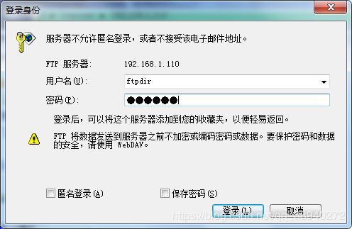 輸入用戶名和密碼,此處使用的用戶名為ftpdir,密碼為123456