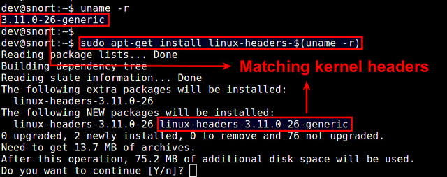 假設(shè)你沒有手動編譯內(nèi)核,你可以使用apt-get命令來安裝匹配的內(nèi)核頭文件。