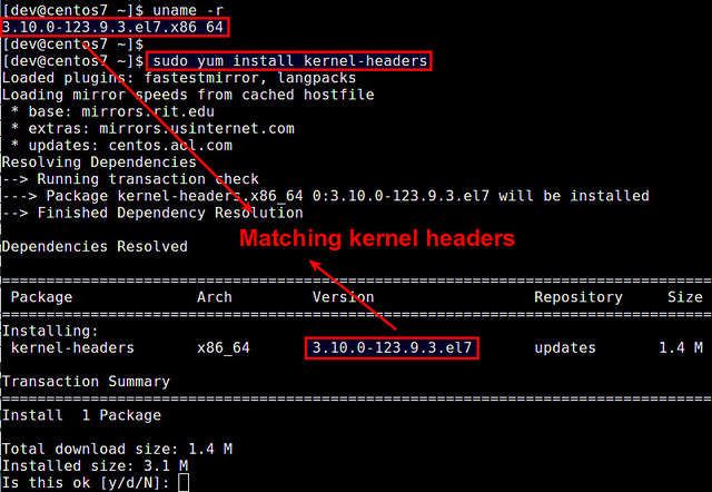 接著用yum命令安裝頭文件。這個命令會自動找出合適的頭文件并安裝。