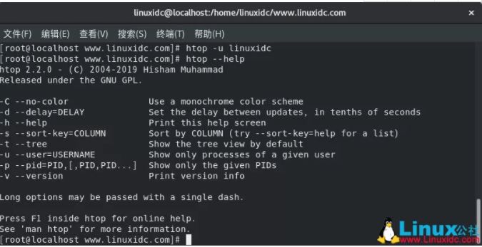 安裝完成后,可以通過(guò)運(yùn)行命令找到有關(guān)htop的更多信息。