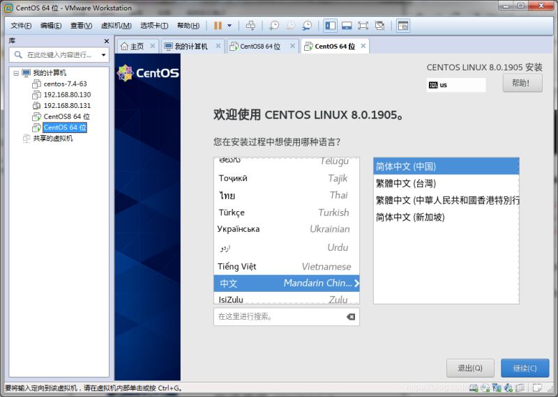 開啟之后選擇第一項(xiàng) install CentOS8,第二項(xiàng)說的是:“測試安裝的光盤鏡像并安裝CentOS 8” Troubleshooting 修復(fù)故障,修復(fù)無法正啟動的Linux系統(tǒng)時,的時候使用。如下圖你可以選擇英文,我這里選擇中文,點(diǎn)擊繼續(xù)