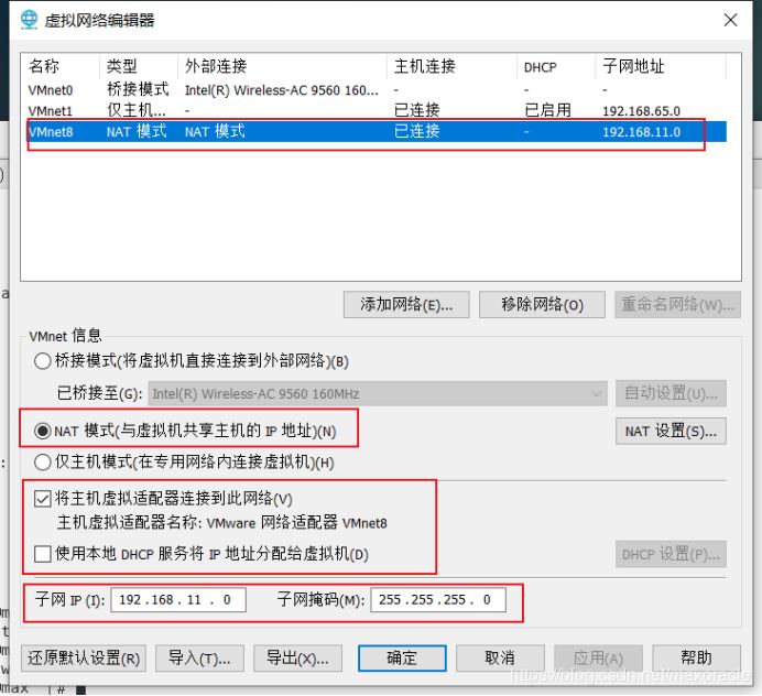 下圖中,彈窗上方列表選擇 “NAT模式”列,子網(wǎng)ip設(shè)置 192.168.xxx.0 , xxx不要設(shè)置的和宿主機(jī)一樣,比如宿主機(jī)ip是192.168.1.123,那么xxx不要等于1就行,如果宿主機(jī)的ip類似170.20.12.14,那xxx隨便設(shè)置。(建議不要把xxx設(shè)置成0或者1,設(shè)置例如110,111等類似的數(shù)字,宿主機(jī)連接不同的WiFi(路由器)時(shí)ip變化可能會(huì)導(dǎo)致“子網(wǎng)ip”的xxx值和宿主機(jī)一樣,如果一樣,就修改“子網(wǎng)ip”的xxx值來避免相同。)