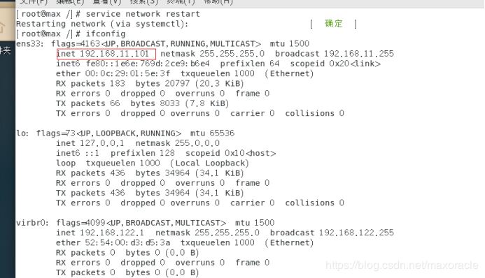 修改完成后,按 “ESC鍵”——在終端窗口中輸入“:wq”,點(diǎn)擊 回車鍵 保存退出編輯重啟服務(wù):service network restart輸入:ifconfig 查看網(wǎng)絡(luò)信息,可以看到我們的靜態(tài)ip設(shè)置成功了