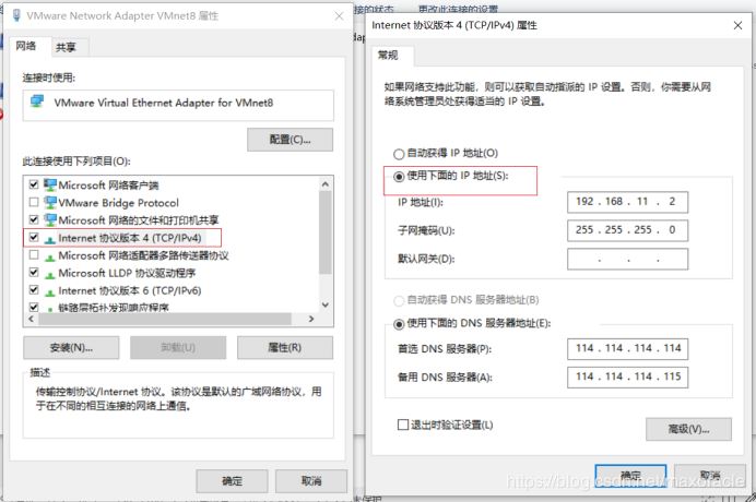 查看VMnet8的網(wǎng)絡(luò)適配器的ipv4的ip地址是否是自定義的,自定義ip地址不能與VMware配置的網(wǎng)關(guān)(192.168.11.1)一樣,也不能與虛擬centos7中配置的靜態(tài)ip地址(192.168.11.101)一樣。