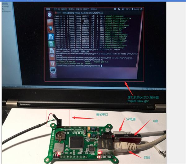 然后找到龍芯的編譯器命令mipsel-linux-gcc并執(zhí)行,生成綠色的hello文件,這就是在開源龍芯板子上直接運行的二進制程序了。將hello文件拷到U盤中,插在智龍主板的USB接口上。