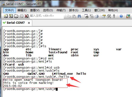 接著利用串口調(diào)試,進入智龍主板的linux系統(tǒng)(debian),在龍芯的debian系統(tǒng)中運行程序。
