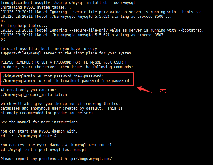 # MySQL啟動之后再執(zhí)行如下命令更改密碼: ./bin/mysqladmin -u root -h localhost.localdomain password 'root'