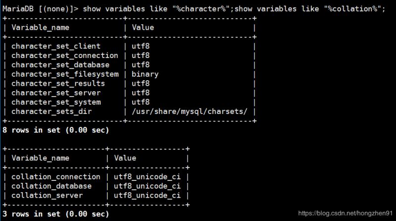 init_connect='SET collation_connection = utf8_unicode_ci' init_connect='SET NAMES utf8' character-set-server=utf8 collation-server=utf8_unicode_ci skip-character-set-client-handshake [root@master my.cnf.d]# mysql -uroot -p123456 MariaDB [(none)]> show variables like "%character%";show variables like "%collation%";
