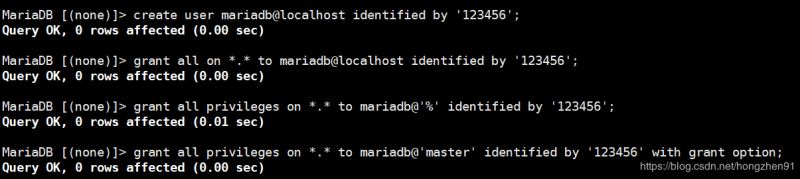 MariaDB [(none)]> create user mariadb@localhost identified by '123456'; MariaDB [(none)]> grant all on *.* to mariadb@localhost identified by '123456'; MariaDB [(none)]> grant all privileges on *.* to mariadb@'%' identified by '123456'; MariaDB [(none)]> grant all privileges on *.* to mariadb@'master' identified by '123456' with grant option; MariaDB [(none)]> use mysql;