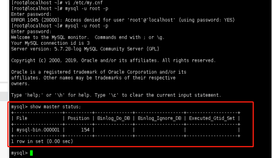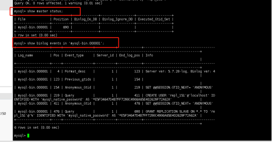 到這里我們主庫就配置完成了;可以使用show master status來查看binlog日志是否發(fā)生了變化。也可以使用show binlog events in ‘mysql-bin.000001';來查看剛剛我們所作的操作。