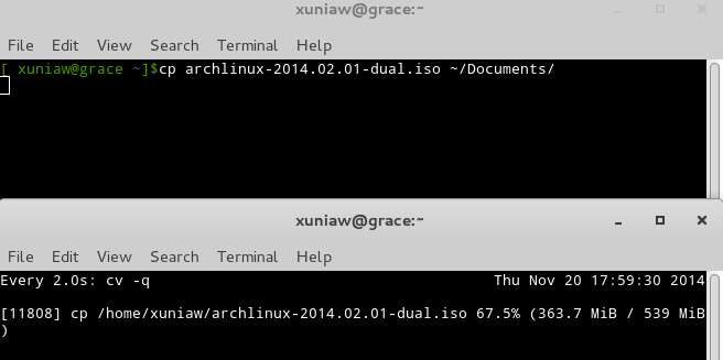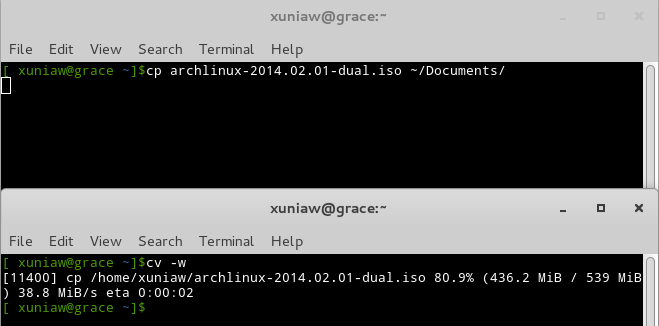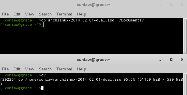 Coreutils Viewer(cv)是一個(gè)簡(jiǎn)單的程序,它可以用于顯示任何核心組件命令(如:cp、mv、dd、tar、gzip、gunzip、cat、grep、fgrep、egrep、cut、sort、xz、exiting)的進(jìn)度。它使用文件描述信息來確定一個(gè)命令的進(jìn)度,比如cp命令。cv之美在于,它能夠和其它Linux命令一起使用,比如你所知道的watch以及I/O重定向命令。這樣,你就可以在腳本中使用,或者你能想到的所有方式,別讓你的想象力束縛住你。