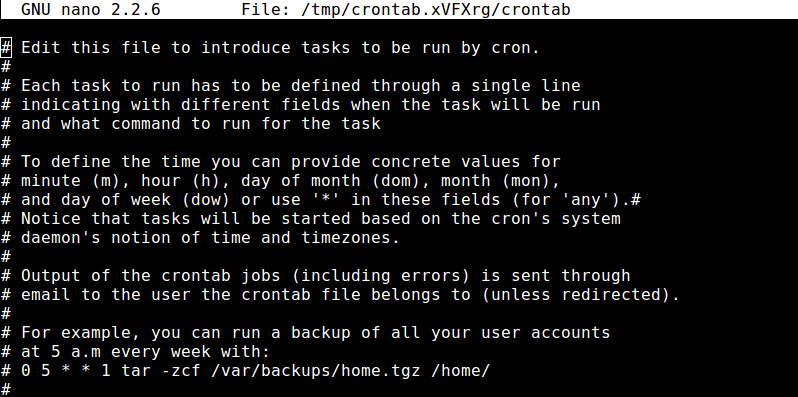 你將會(huì)看見(jiàn)一個(gè)文本編輯窗口,這里你可以添加或者編輯cron任務(wù)。默認(rèn)使用nono編輯器。