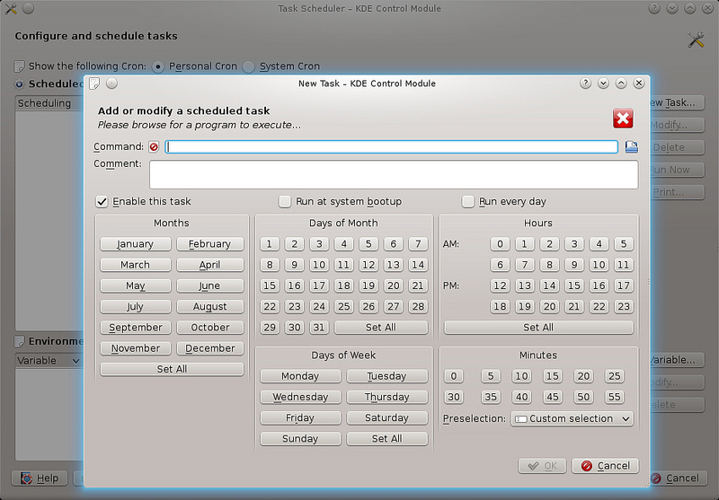 在KDE桌面中,有一個(gè)Task Scheduler(kcron包)。