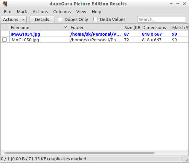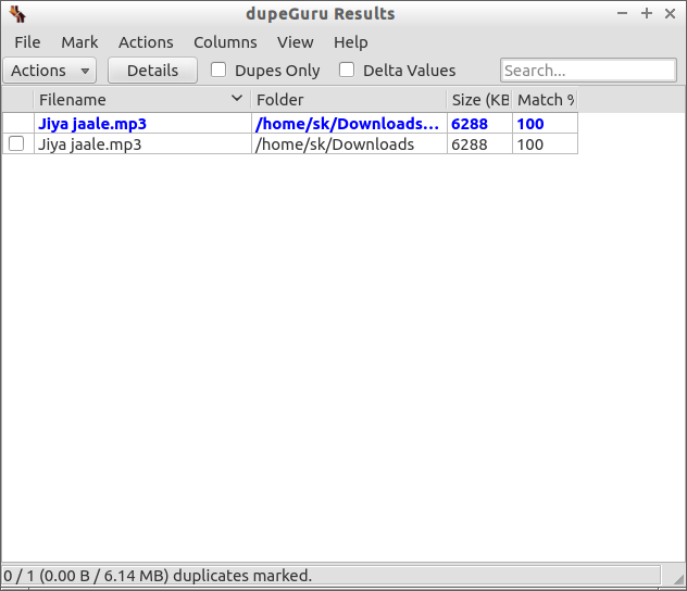 一旦所選目錄中含有重復(fù)文件,那么它將在窗口中展示重復(fù)文件。正如你所看到的,在下面的截圖中,我的下載目錄中有一個(gè)重復(fù)文件。